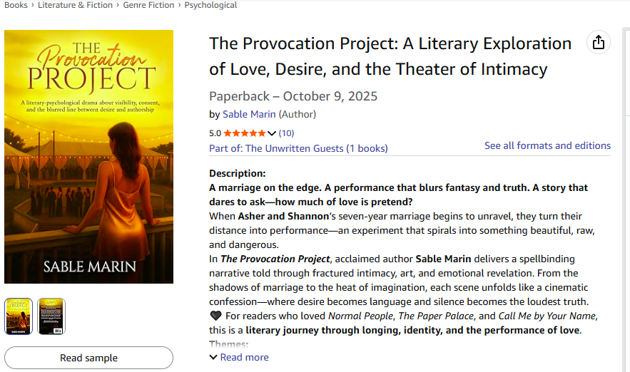 In The Provocation Project, acclaimed author Sable Marin delivers a spellbinding narrative told through fractured intimacy, art, and emotional revelation. From the shadows of marriage to the heat of imagination, each scene unfolds like a cinematic confession—where desire becomes language and silence becomes the loudest truth.